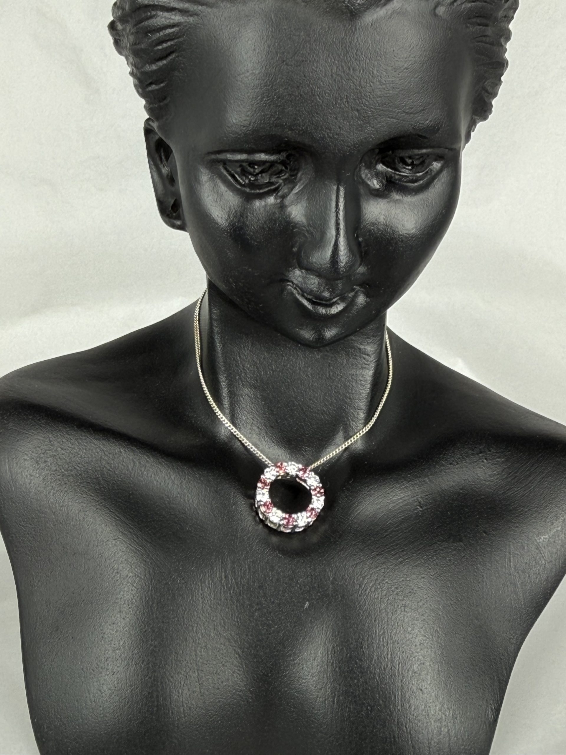 Crafted in polished sterling silver, the circular pendant symbolises eternity, harmony and connection. Pink tourmaline is known as the stone of love and emotional healing, while crystal quartz represents clarity and positive energy — together forming a meaningful and elegant piece.